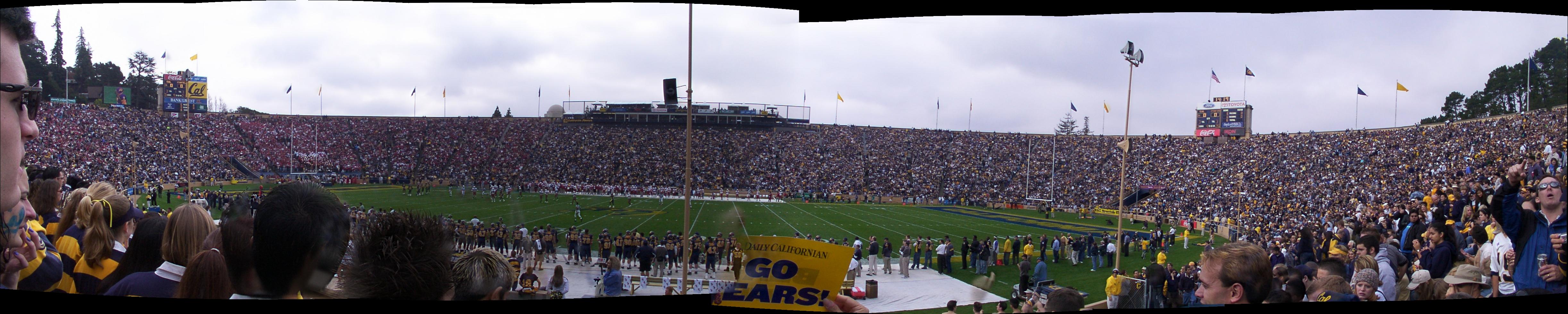Feb. 18th, 2005 02:32 pmSo I had a bunch of shots I took of Memorial Stadium during the early minutes of Big Game 2002 that I wanted to merge together into one shot, to give you some idea of what Big Game *looks* like. But I hadn't found a way. Until phen mentioned Autostitch. I downloaded the program and ran the pictures through it, and here's what I got back: